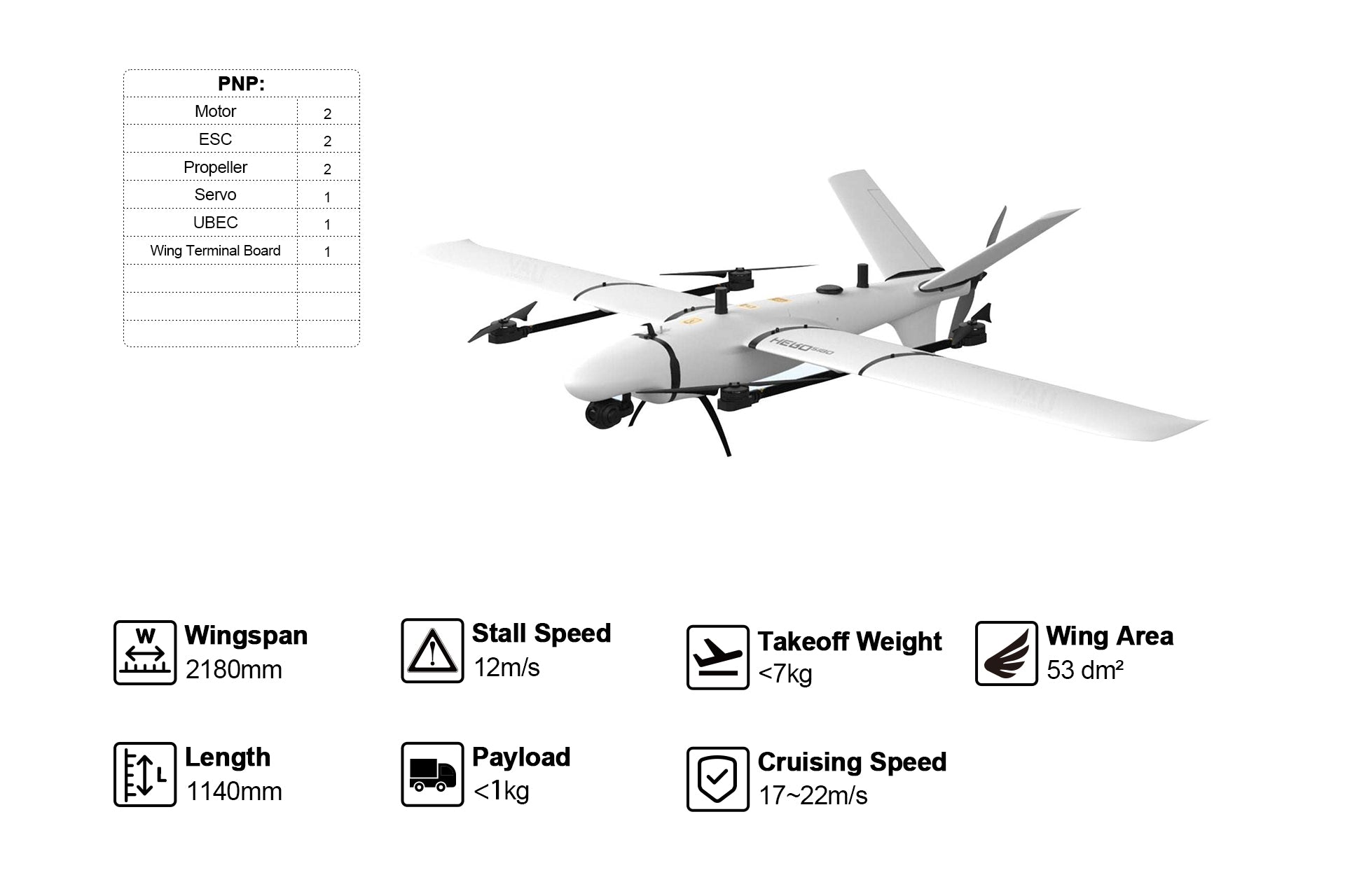 PNP (Recommended): Includes airframe and basic spare parts, dedicated servos, fixed-wing motors, VTOL motors, ESCs, and propellers, but does not include installation. You will need to provide your own flight controller (FC), radio link, and batteries.